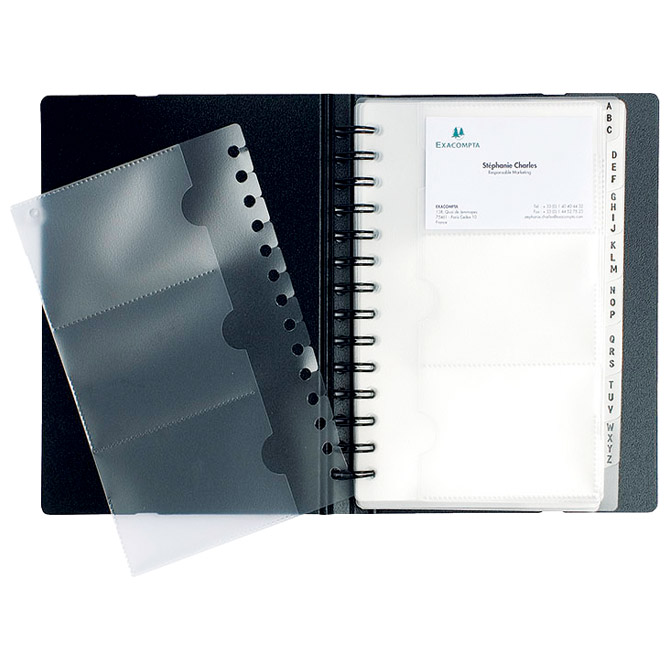 reciklirani PP; sa spiralom; 20 uložnih fascikli za vizitke; pregrade sa slovnim oznakama od A do Z; zatvara se s gumicom kapacitet: 120 kartica; dimenzija: 148× 203 mm; 3 vizitke po stranici; 1 stupac – 3 reda Pakiranje: 1/5