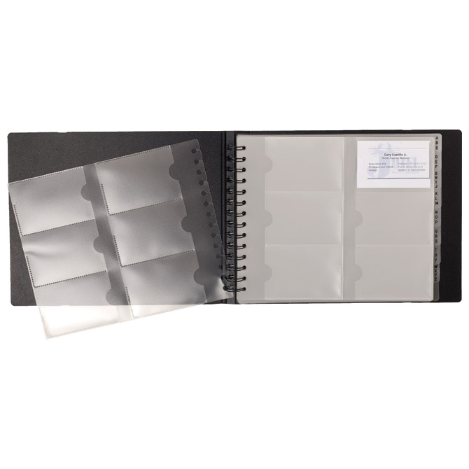 reciklirani PP; sa spiralom; 20 uložnih fascikli za vizitke; pregrade sa slovnim oznakama od A do Z; zatvara se s gumicom kapacitet: 240 kartica; dimenzija: 254x204x28 mm; 6 vizitki po stranici; 2 stupca – 3 reda Pakiranje: 1/5