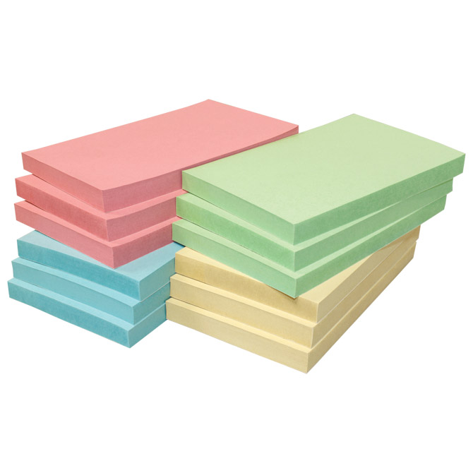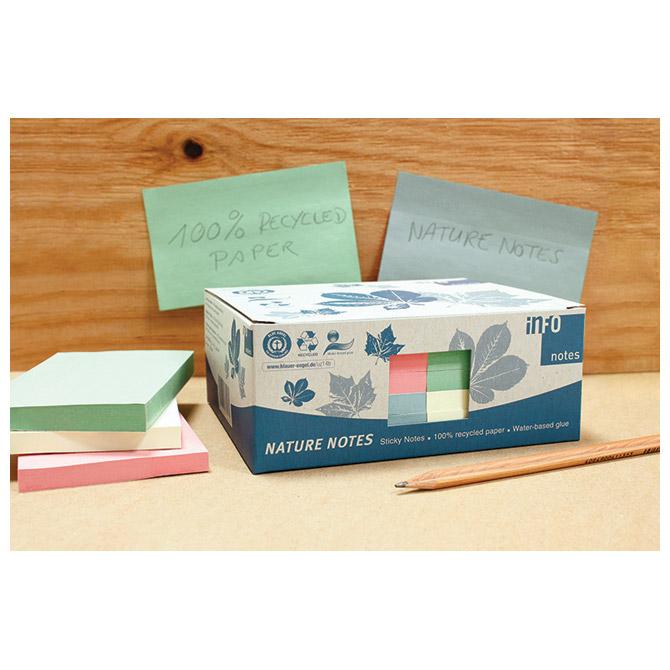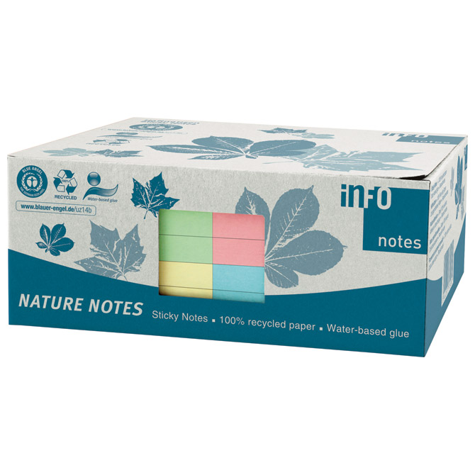 dimenzija: 125×75 mm; 12×100 listova; mogućnost višestrukog premještanja; izrađen od 100 % recikliranog papira; ekološki prihvatljiv (Blue Angel certifikat); ljepilo je bez otapala izrađeno na bazi vode; 4 pastelne boje: roza, plava, zelena i žuta; u 100 % recikliranoj kartonskoj kutiji Pakiranje: 1/20/1000