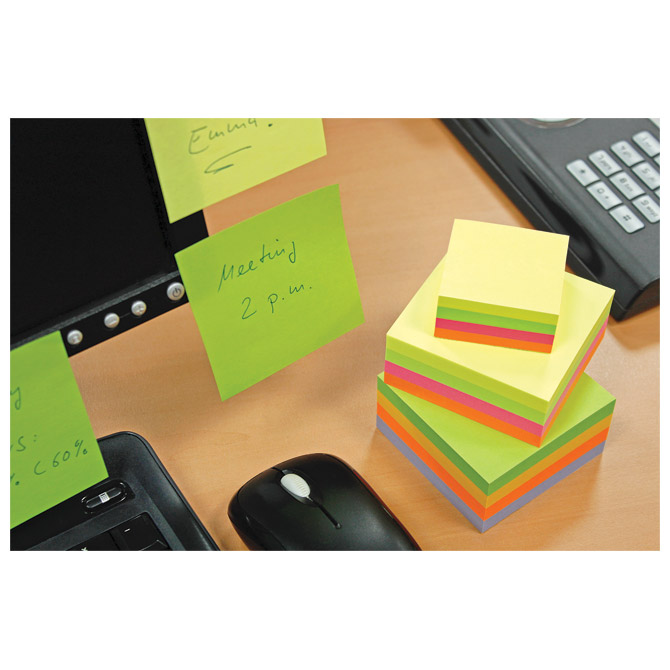 dimenzija: 50×50 mm; 240 listova; mogućnost višestrukog premještanja; ljepilo je bez otapala izrađeno na bazi vode; 4 neon boje: narančasta, roza, zelena i žuta Pakiranje: 1/100