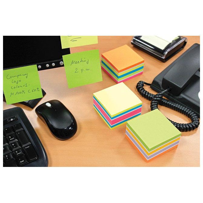 dimenzija: 75×75 mm; mogućnost višestrukog premještanja; ljepilo je bez otapala izrađeno na bazi vode 450 listova / Brilliant / 4 boje: bijela (2×30 listova), plava (2×60 listova), roza (150 listova) i žuta (2×60 listova) Pakiranje: 1/12
