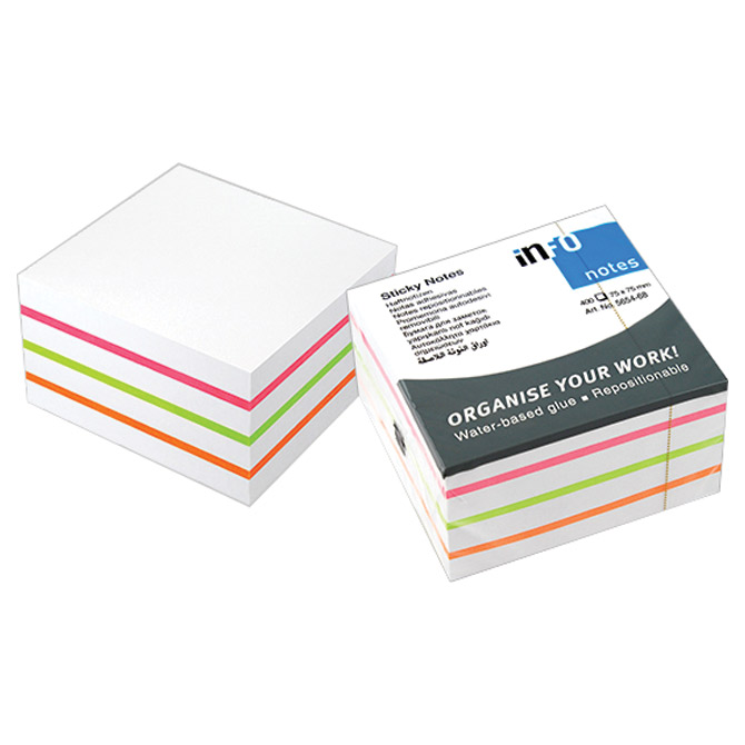 dimenzija: 75× 75 mm; mogućnost višestrukog premještanja; ljepilo je bez otapala izrađeno na bazi vode 450 listova / 4 boje: bijela, narančasta, roza i zelena Pakiranje: 1/12