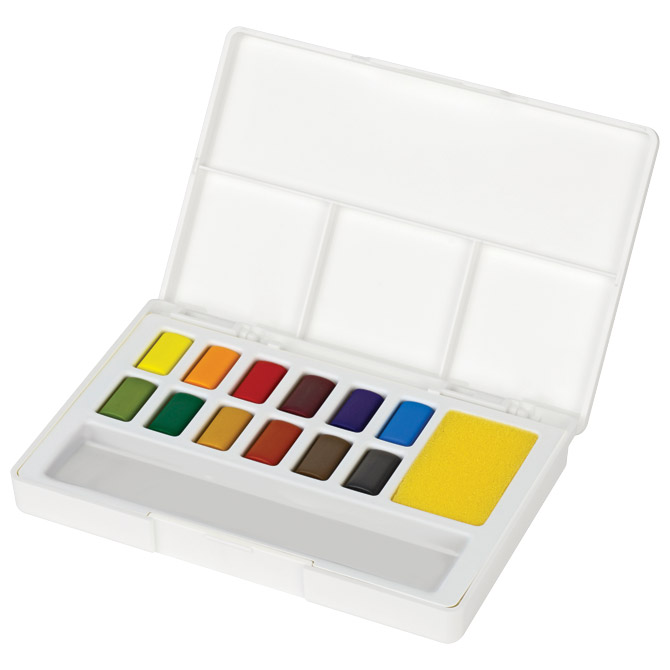 12 boja; mjesto za kist; sjajne i svijetle boje potpuno topive u vodi; savršena mogućnost miješanja svijetlih i tamnih nijansi; visoka kvaliteta pigmenta; odvojiva paleta koja se lako čisti; PVC kutija Pakiranje: 1