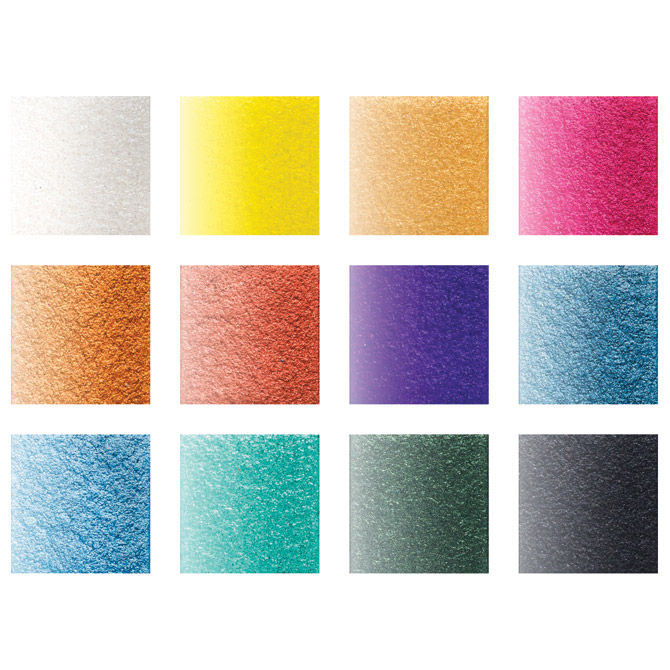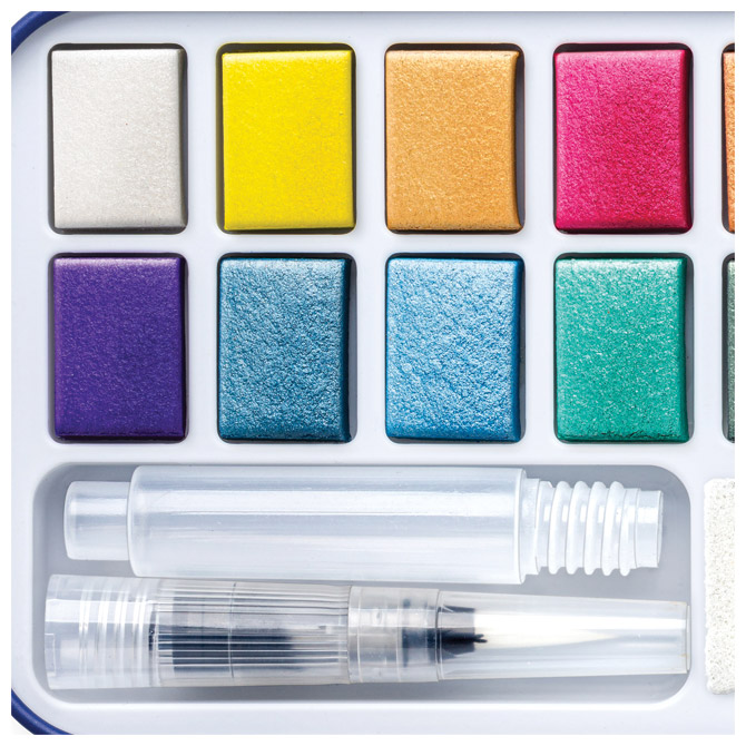 metalik boje; idealno za početnike i hobiste; set se sastoji od: 12 boja, kist sa spremnikom za vodu (veličina M), spužvica; poklopac je paleta za mješanje boja; u metalnoj kutiji; sa stražnje strane kutije je prsten za lakše držanje Pakiranje: 1/6/72