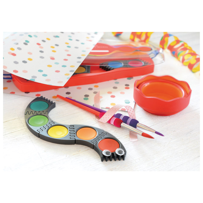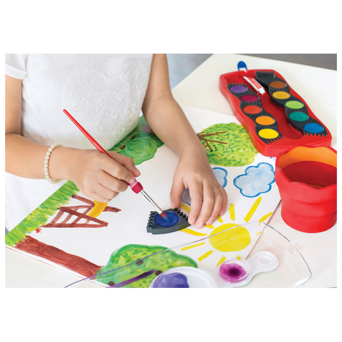 fi 24 mm; na prozirnom poklopcu je paleta sa 5 bijelih posudica; poklopac se može odvojiti i jednostavno očistiti (spaja se sa dvije kopče); na poklopcu je mjesto za upisivanje imena; svijetle boje s visokom neprozirnošću i mogućnošću pokrivanja; za različite vrste slikarskih tehnika; svaka boja je u svojoj kućici koje se mogu proizvoljno slagati u razne oblike; idealano za bojanje, slaganje i igranje; razvijeno u skladu s najnovijim standardima učenja; PVC kutija 12 boja / crvena / s bijelom temperom u tubi Pakiranje: 1/20