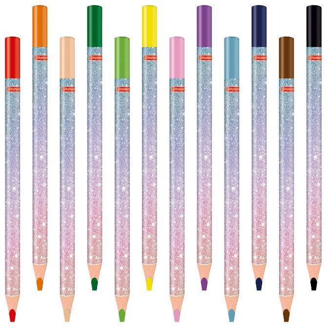 šiljene; debljina mine: 5 mm; trokutaste; duljina olovke: 176 mm; s holografskim premazom koji može stvarati efekt refleksije svjetlosti; set od 12 boja; blister Pakiranje: 1/12