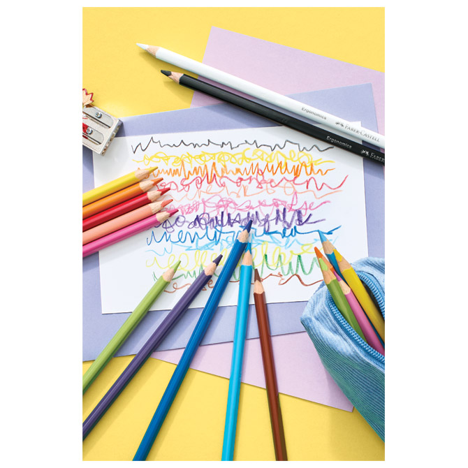 šiljene; debljina mine: 4 mm; trokutaste; ergonomske; živopisne boje; jako mekan vrh za veću pokrivenost površine papira bojanjem; posebno je otporna na lomljenje (specijalno spajana – SV); ispire se sa većine tkanina; eko olovka (drvo iz certificiranog održivog šumarstva); set od 12 boja; kartonska kutija; blister Pakiranje: 1/6