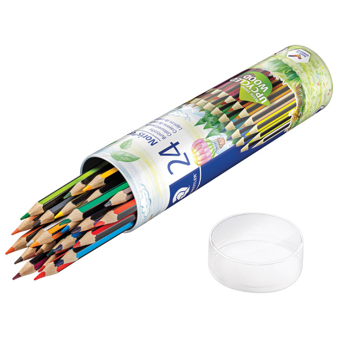 šiljene; šesterokutne; ergonomske; neklizajuća površina olovke; izrađena od prerađenog drvnog otpada (Upcycled Wood); atraktivan prugasti dizajn; pojačana otpornost na udarce; izrađena od certificiranog drva set od 24 boje; u metalnom tuljku Pakiranje: 1/6/30