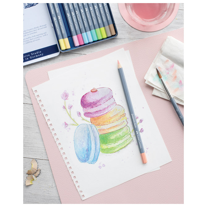 šiljene; debljina mine: 3,3 mm; šesterokutne; visokokvalitetni pigment; izvrsna svjetlosna postojanost; tijelo lakirano eko lakom na bazi vode; eko olovka (drvo iz certificiranog održivog šumarstva); jako mekan vrh za veću pokrivenost površine papira bojanjem; mina u potpunosti topiva u vodi (pažnja: treba izbjegavati uranjanje akvarel olovke u vodu); posebno je otporna na lomljenje (specijalno spajana – SV); lako se šilji klasičnim šiljilima set od 12 pastelnih boja / u metalnoj kutiji Pakiranje: 1/5