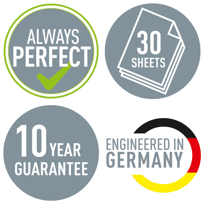 ima čvrsti graničnik s jasnim oznakama formata: A4, A5, A6, folio, US-Quart i položaj 8x8x8 cm (mogućnost bušenja 4 rupe);