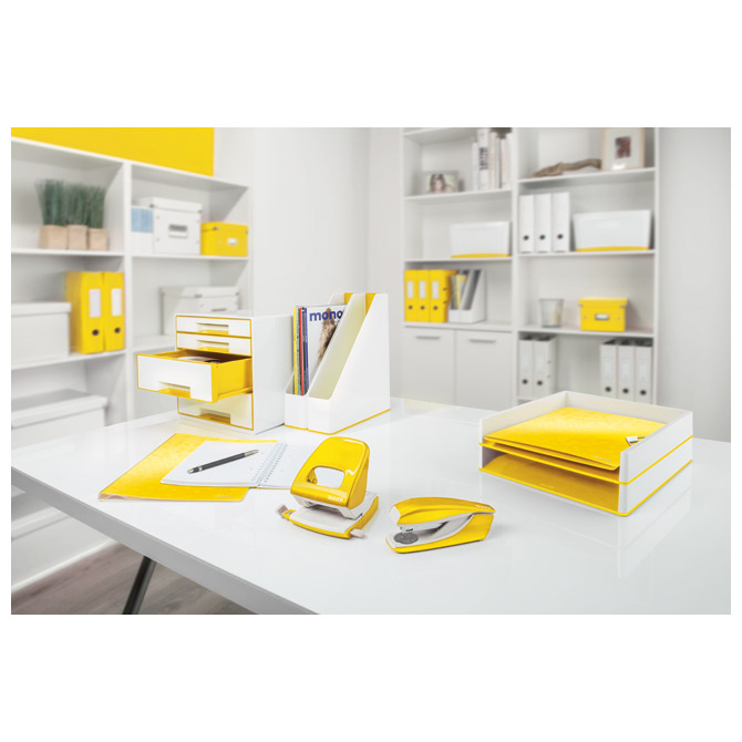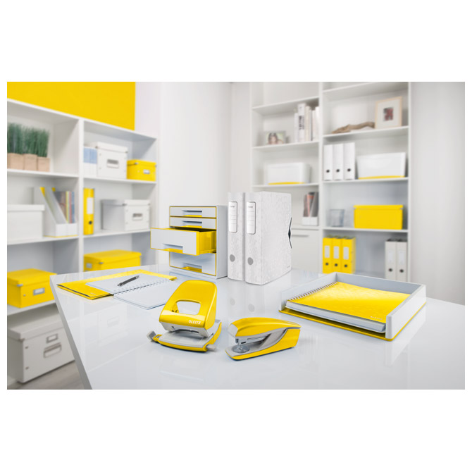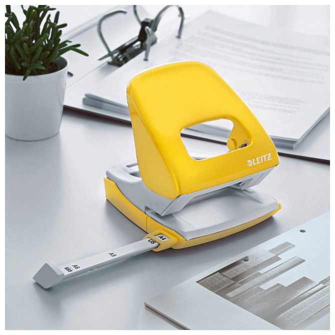 2 rupe; buši do 30 listova ili debljina 3 mm; razmak između rupa je 80 mm; sa spremnikom za otpadni papir u boji bušača; ima plastični graničnik za formate: A4, A5, A6,…; garancija 10 godina; blister