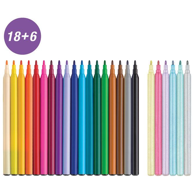 okrugli vrh (iznimno čvrst); živopisne boje; ima tintu na bazi vode; idealne za crtanje i skiciranje na papiru, kartonu, drvu itd.; u kartonskoj kutiji; blister set od 18 boja + 6 pastelnih boje s cool efektom sjaja + naljepnice jednoroga Pakiranje: 1/6
