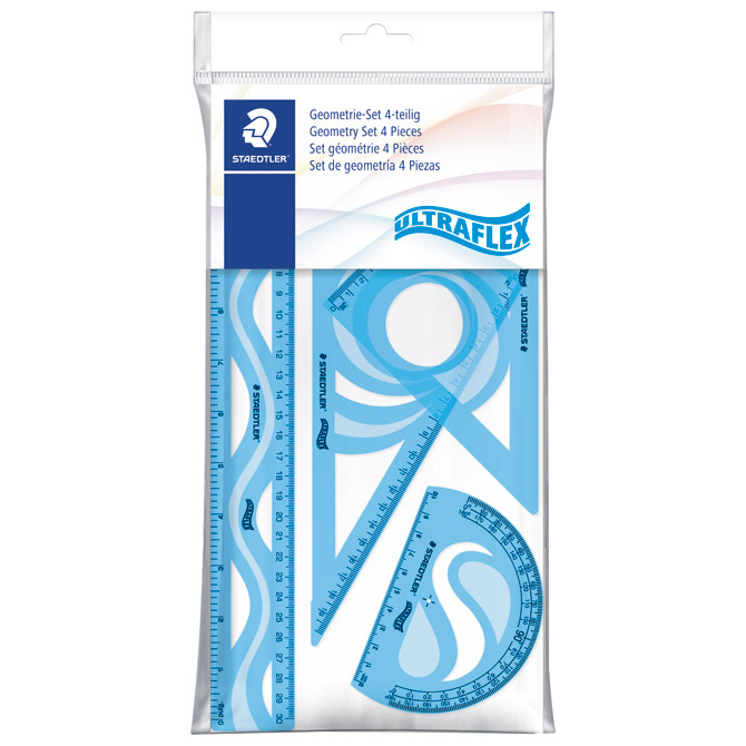 sadrži: ravnalo 30 cm, trokut 30°/60° 21 cm, trokut 45° 21 cm i kutomjer 180° 10 cm; blister Pakiranje: 1/12/120