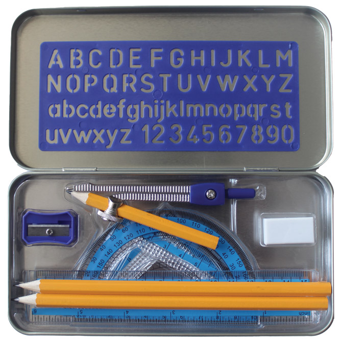 sadrži: 1 x šestar školski, 3 x grafitne olovke, 1 x gumica, 1 x šiljilo, 1 x ravnalo 15 cm, 1 x kutomjer, 2 trokuta i 1 x šablona za slova; metalna kutija Pakiranje: 1/12/72