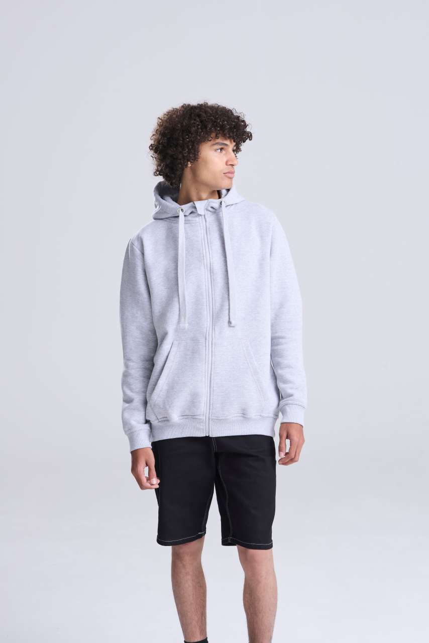 70 % prstenasto ispreden pamuk / 30 % poliester Standardni kroj Trodijelna kapuljača od tkanine s jednostrukom unutrašnjosti od žerseja Težak model Rebraste manšete i porub Plastični zatvarač YKK i jezičak sa zaštitom za bradu Odvojeni prednji džepovi Plosnate uzice Plosnati šavovi na džepu Unutrašnjost od četkanog flisa Etiketa koja se može odstraniti Vanjski dio od 100 % pamuka