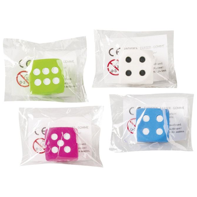za grafitnu olovku u obliku kocke s brojevima 1-6; dimenzija: 2×2 cm; 4 boje: bijela, plava, roza i zelena; u pvc vrećici Pakiranje: 20
