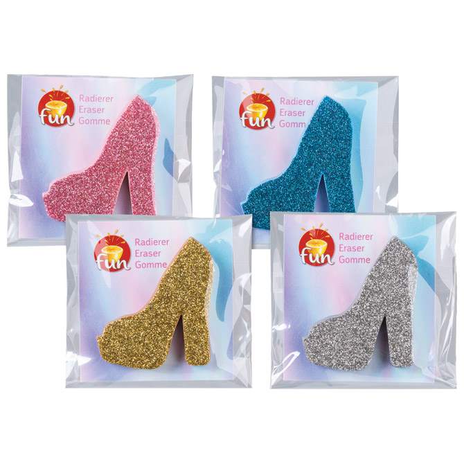 za grafitnu olovku; oblik štikle; dimenzija: 3×4 cm; glitter; 4 boje: plava, roza, srebrna i zlatna; u PVC vrećici Pakiranje: 1/16