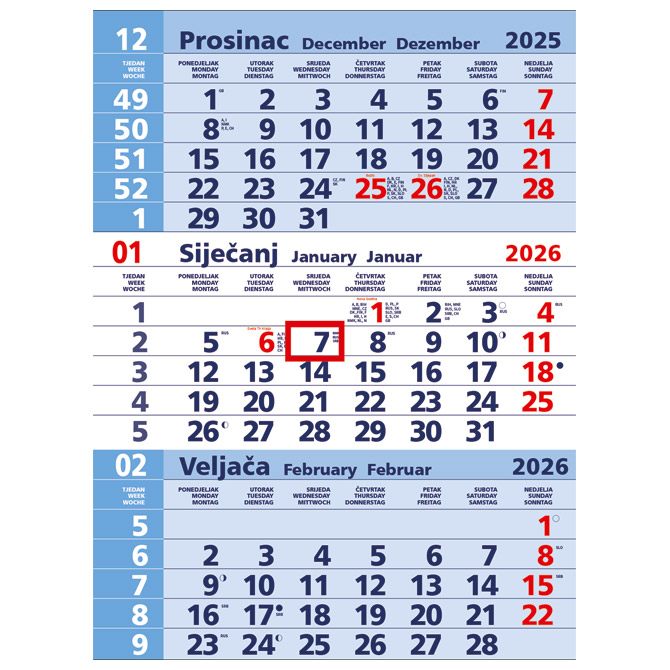 bez zaglavlje i spirale; dimenzija: 29,5×39,3 cm; pokazivač trn; obilježeni međunarodni praznici; isti kao kalendar šifra: 000013275