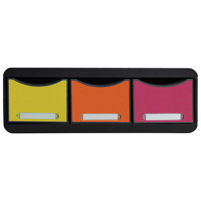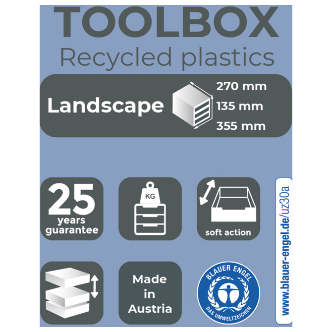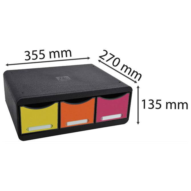 3 ladice (A6); zatvorena; dimenzija kutije: 355x135x270 mm (A4+); idealna za pohranu predmeta kao što su: olovke, notesi, kabel, bušač..; za dokumente manje od formata A6; za urednu pohranu stolnog pribora i uštedu prostora; idealna za dom i ured; visina od 13 cm idealna da kutija služi kao stalak za monitor; zamjenjiva etiketa na svakoj ladici; ima sigurnosnu kočnicu za ladice; lagano otvaranje ladica; mogućnost slaganja kutija jedna na drugu; rub ladice sortirane boje: narančasta, roza i žuta; izrađena od reciklirane plastike (Blue Angel certifikat) Pakiranje: 1/96