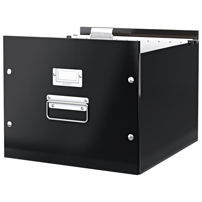 s poklopcem; dimenzija: 357x367x285 mm; kapacitet: 15 visećih mapa formata A4; PP laminirani čvrsti karton; ima pričvršćivače pomoću kojih se kutija može brzo i lako sastaviti i rastaviti po potrebi; poklopac je sa ojačanim rubovima; visokokvalitetni metalni džepić s etiketom s vanjske strane; na bočnim stranama su metalne ručke radi lakšeg transporta; težina: 1,47 kg