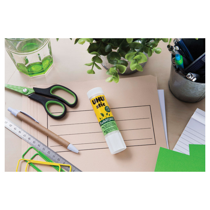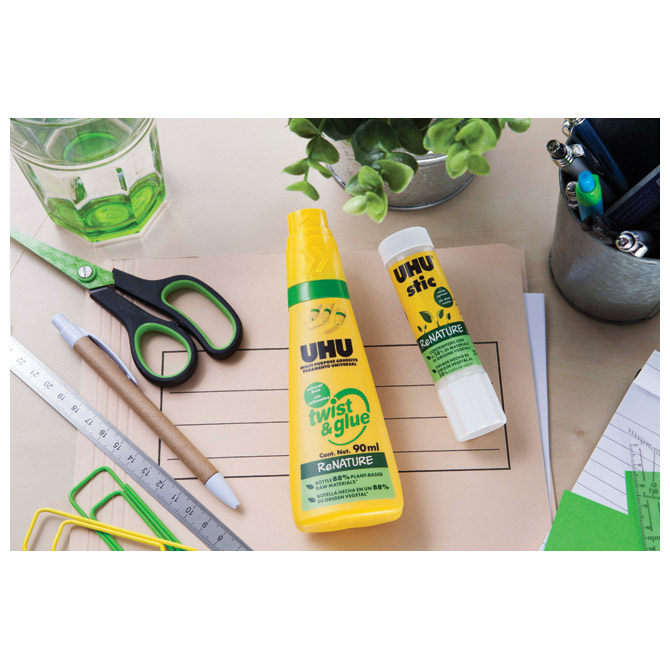 bez otapala; ReNature (smanjuje emisije CO2 i snižava potrošnju fosilnih sirovina u odnosu na standardno ljepilo u stiku UHU); formula ljepila sastoji se od 98 % prirodnih sastojaka (uključujući vodu); za lijepljenje: papira, kartona, fotografija, ekspandiranog polistirena Styrofoam®, naljepnica, tekstila i sl.; za snažno, brzo i trajno lijepljenje; lako se nanosi; ne gužva papir i lako se uklanja vodom; poklopac s navojem produžava vijek upotrebljivosti ljepila; ambalažu čini 58 % biljnog materijala; boja ljepila nakon sušenja je prozirna Pakiranje: 12/120