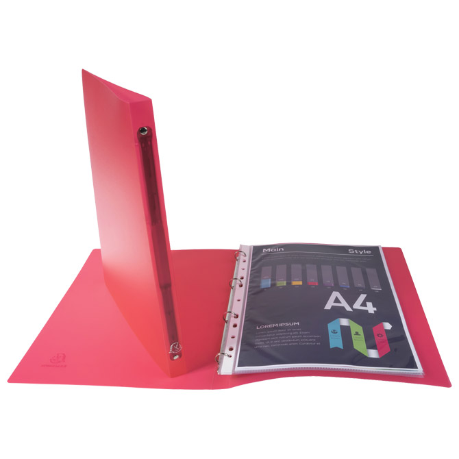 format: A4; PP; 5 boja: bijela, crvena, svijetloplava, plava i zelena 4 ringa; dimenzija: 250×320 mm; ring fi: 15 mm; hrbat: 20 mm; debljina: 0,5 mm Pakiranje: 20