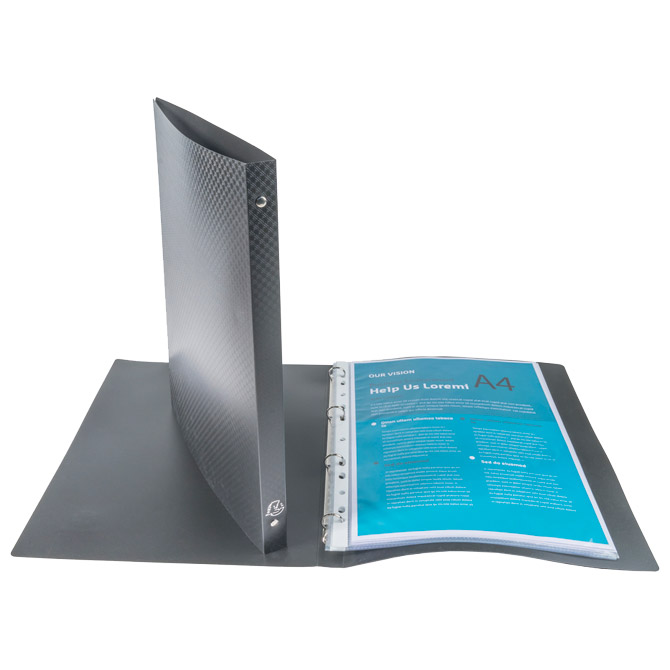 format: A4; dimenzija: 250×320 mm; 4 ringa; ring fi: 15 mm; kapacitet: 140 listova; hrbat: 20 mm s etiketom; debljina: 0,5 mm; PP Pakiranje: 20