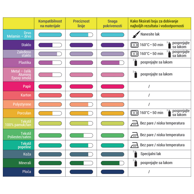 za pisanje i dekoriranje na svjetlom i tamnom papiru i primjena na gotovo svim površinama (plastika, metal, tkanina, staklo…