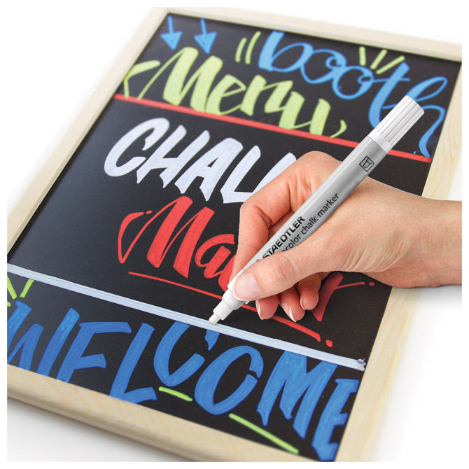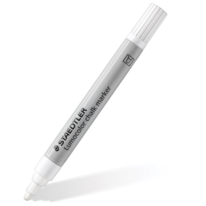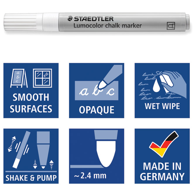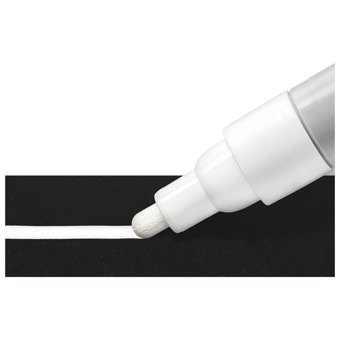 nepermanentni; okrugli vrh; širina ispisa 2,4 mm; tekuća kreda na bazi vode; za neprozirno dekoriranje i pisanje po glatkim površinama (staklo, prozor, tamna ploča…); slabog mirisa; briše se vlažnom krpom; u kartonskoj kutiji (od 80 % recikliranog materijala) Pakiranje: 1/10