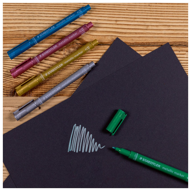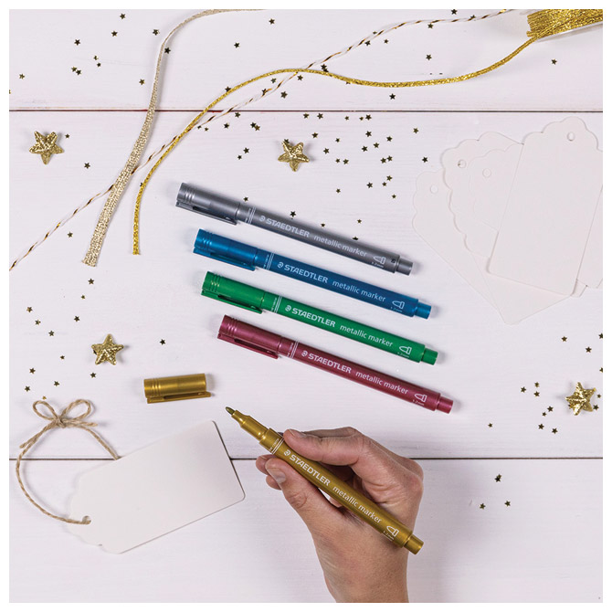 okrugli vrh; širina ispisa 1-2 mm; za pisanje i dekoriranje na svijetlom i tamnom papiru te kartonu; idealan za čestitke; lako se briše sa glatkih površina (stakla, ogledala… ) pomoću vlažne krpe set od 5 boja: crvena, plava, srebrna, zelena i zlatna; blister Pakiranje: 1/10/120