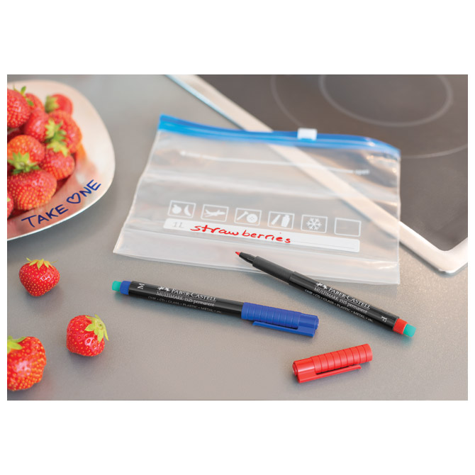 širina ispisa: 0,6 mm (F – Fine); vodootporan; jako otporan na svjetlo; tinta izvrsno prianja i suši se trenutačno; trajna tinta za gotovo sve glatke površine: staklo, folije, CD-e, DVD-e, plastiku, kamen, drvo, metal; može se brisati s ugrađenom posebnom gumicom; intenzivne boje i jasne linije set od 8 boja: crna, crvena, plava, zelena, narančasta, smeđa, žuta i ljubičasta; u PVC etui-u; blister Pakiranje: 1/5/200