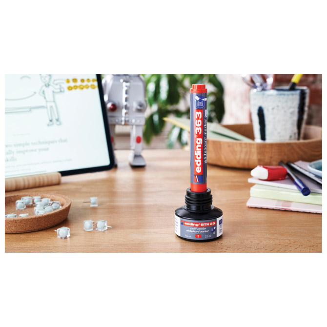 nepermanentni, pigmentni s mogućnošću ponovnog punjenja; klinasti vrh; širina ispisa 1-5 mm; otporan na svjetlo; brzo se suši; lako se briše sa svih glatkih površina (staklo, melamin,… ); za pisanje po svim glatkim površinama i bijeloj ploči; marker može biti bez poklopca par dana, a da se ne osuši set od 4 boje: crna, crvena, plava i zelena; u PVC etui-u; blister Pakiranje: 1/10/80