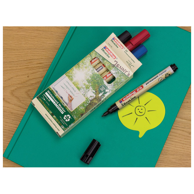 nepermanentni; s mogućnošću ponovnog punjenja; okrugli vrh; širina ispisa: 1,5-3 mm; otporan na svjetlo; brzo se suši; lako se briše sa svih glatkih površina (staklo, melamin,… ); za pisanje po svim glatkim površinama i bijeloj ploči; marker može biti bez poklopca par dana, a da se ne osuši; Eco-friendly (najmanje 90 % ukupne plastike je napravljeno od recikliranog materijala) set od 4 boje: crna, crvena, plava i zelena; u kartonskoj kutiji; blister Pakiranje: 1/10/80