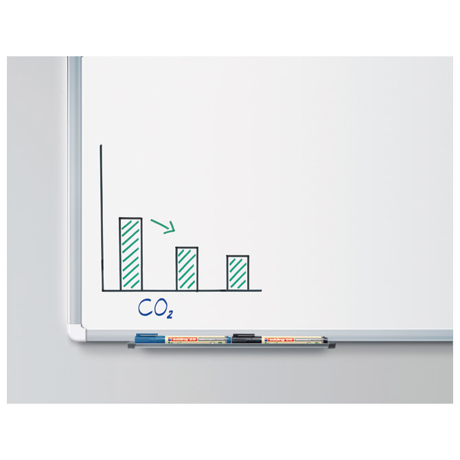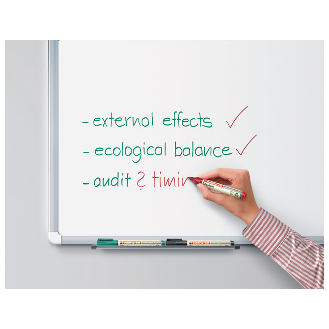 nepermanentni; s mogućnošću ponovnog punjenja; okrugli vrh; širina ispisa: 1,5-3 mm; otporan na svjetlo; brzo se suši; lako se briše sa svih glatkih površina (staklo, melamin,… ); za pisanje po svim glatkim površinama i bijeloj ploči; marker može biti bez poklopca par dana, a da se ne osuši; Eco-friendly (najmanje 90 % ukupne plastike je napravljeno od recikliranog materijala) Pakiranje: 10/400