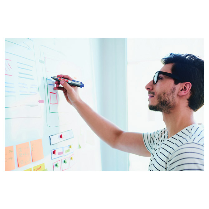 nepermanentni; s mogućnošću ponovnog punjenja; okrugli vrh; širina ispisa 1,5-3 mm; bez kapice; sistem izvlačenja i uvlačenja koji čuva od isušivanja markera; lako se briše sa svih glatkih površina (staklo, melamin,… ); za pisanje po svim glatkim površinama i bijeloj ploči Pakiranje: 10/300