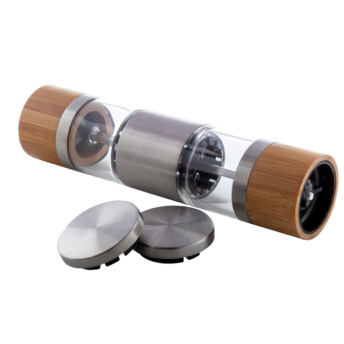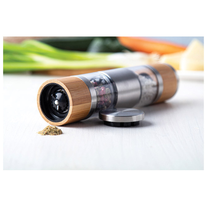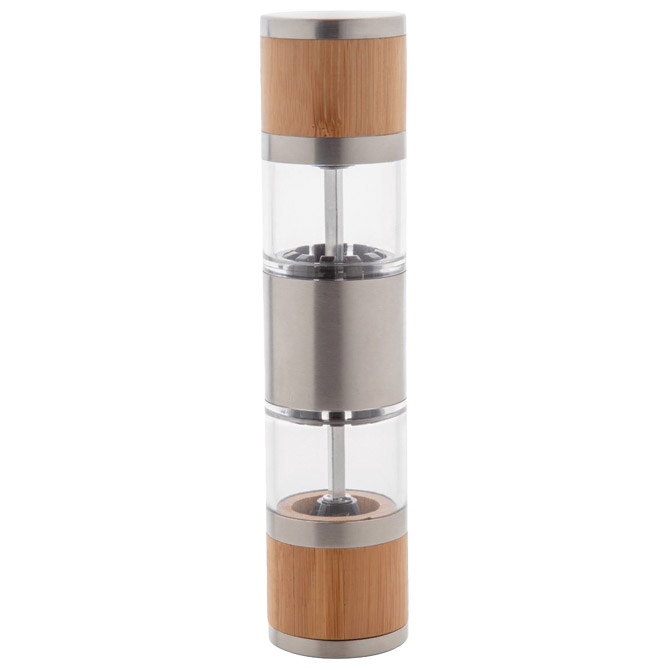 Dvostrani ručni mlin za sol i papar u kućištu od nehrđajućeg čelika i bambusa, s keramičkom jezgrom mlina. Pakiranje: 1/24