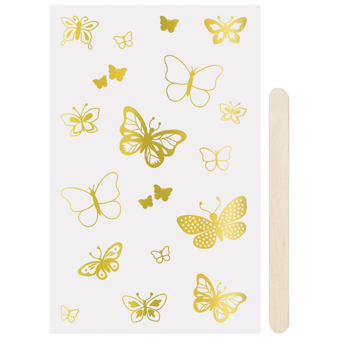 sadrži: 1 list sa motivima dimenzije: 10× 19 cm i 1 drveni štapić; idealan za dekoriranje papira i kartona, također prenosiv na glatke površine poput stakla, porculana, drva i mnogih drugih u dekorativne svrhe; sa uputama (izrezati motive, odlijepiti podložnu foliju, staviti na odabrano mjesto i prenijeti trljanjem); nije perivo u perilici posuđa; blister Leptiri Pakiranje: 1/6