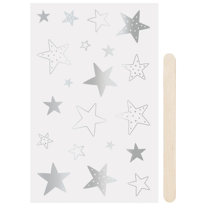 sadrži: 1 list sa motivima dimenzije: 10× 19 cm i 1 drveni štapić; idealan za dekoriranje papira i kartona, također prenosiv na glatke površine poput stakla, porculana, drva i mnogih drugih u dekorativne svrhe; sa uputama (izrezati motive, odlijepiti podložnu foliju, staviti na odabrano mjesto i prenijeti trljanjem); nije perivo u perilici posuđa; blister Zvijezde – sjajne Pakiranje: 1/6