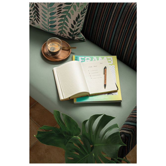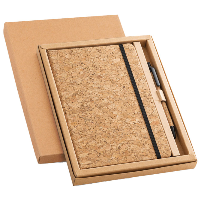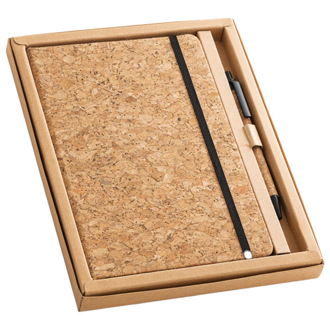 Set bilježnica A5 + kemijske olovka od plua. Bilježnica sa 192 stranice s crtama od bež papira. Kemijska olovka s plavom tintom. Isporučuje se u poklon kutiji od kraft papira;