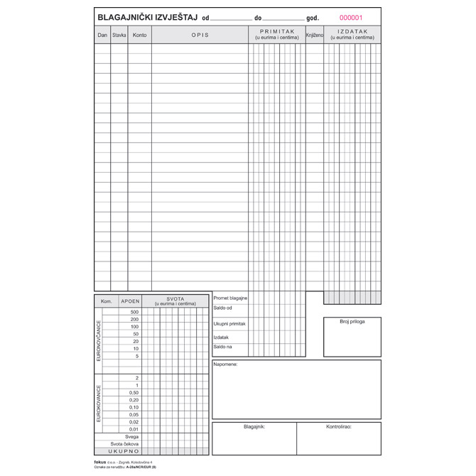 A-28a/NCR/EUR; blagajnički izvještaj; format: A4; broj listova: 100 Pakiranje: 30