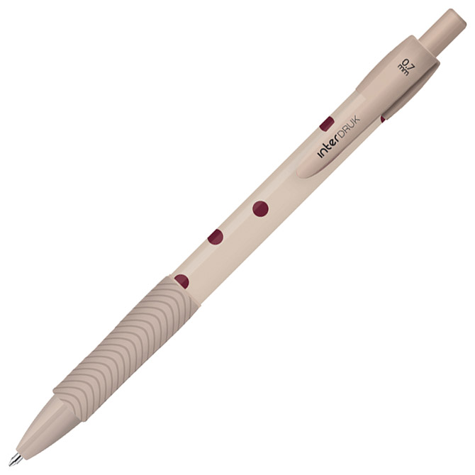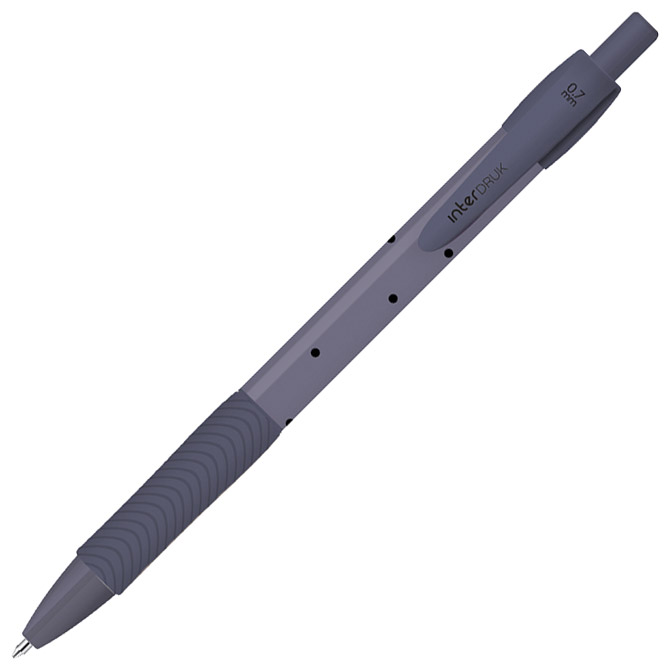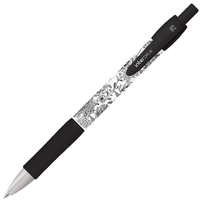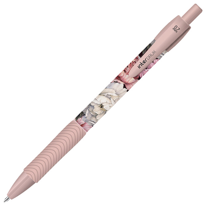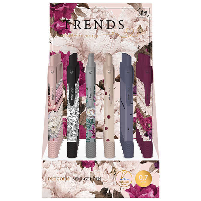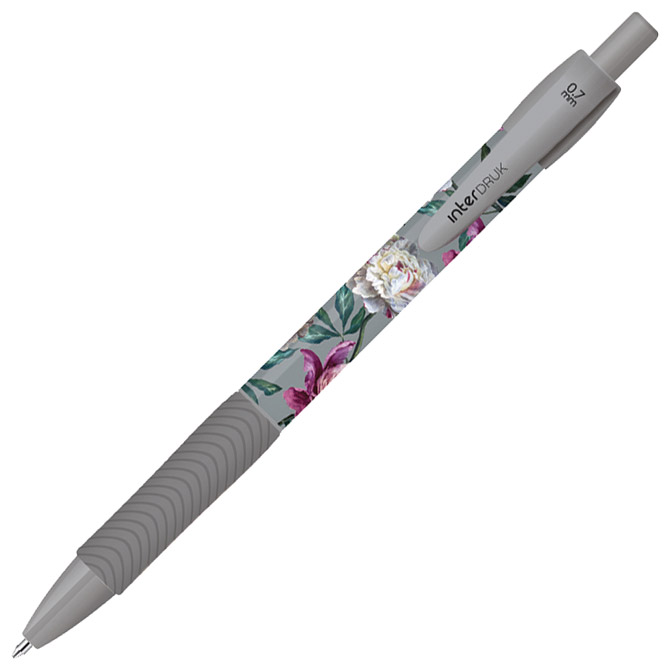 promjer kuglice: 0,7 mm; tinta na bazi gela; ergonomski grip; plastično tijelo olovke i vrh; metalna klipsa; plastični uložak; pritisni mehanizam; boja tinte: plava; 6 dezena Pakiranje: 36