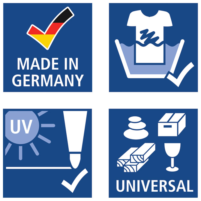 primjena moguća na gotovo svim površinama (staklu, koži, tekstilu, kamenu, metalu, drvu i plastici);