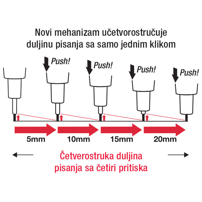 ergonomski oblikovan grip; s gumicom; metalna klipsa; sa metalnim vrhom koji se posve uvlači u olovku (sistem protiv pucanja mine); pritiskom vrha olovke mina se nadoknađuje; novi mehanizam učetverostručuje duljinu pisanja sa samo jednim klikom; kapica sa okretnim sistemom za označavanje koja mina se koristi (3H, 2H, H, HB, B ili F); 2 funkcije: za pisanje i tehničko crtanje 0,5 mm Pakiranje: 12/300