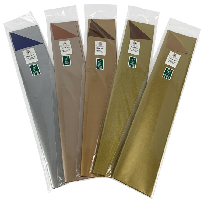 metalik dvobojni ukrasni papir; vodootporan; dimenzija: 50× 75 cm; 24-25 g/m2; 6 listova; tri puta presavijeno; proizvod ima oznaku FSC (papir dolazi iz šuma koje podržavaju održivo gospodarenje i druge ekološke i društvene standarde); blister Z8017 Pakiranje: 1/70