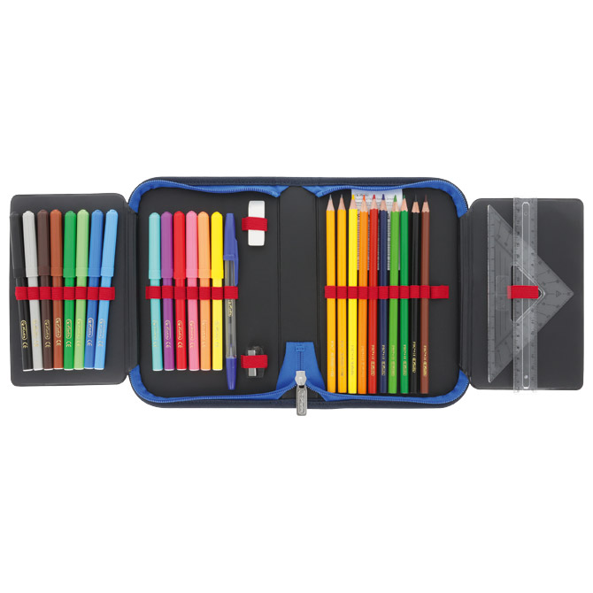 1 zip; 2 preklopa; punjena s 31 komadom pribora: flomaster školski 14 boja, boje drvene 8 boja, olovka grafitna HB x 2 komada, šiljilo, gumica, ravnalo pvc, trokut, olovka kemijska; dimenzija: 20,5x14x3,8 cm High speed Pakiranje: 1/36