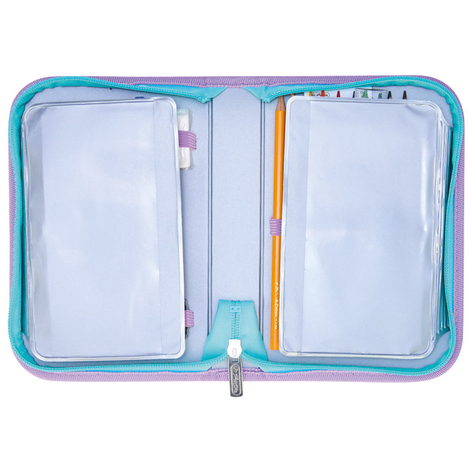 1 zip; 2 preklopa; punjena s 31 komadom pribora: flomaster školski 14 boja, boje drvene 8 boja, olovka grafitna HB x 2 komada, šiljilo, gumica, ravnalo pvc, trokut, olovka kemijska; dimenzija: 20,5x14x3,8 cm Ocean Lights Pakiranje: 1/36