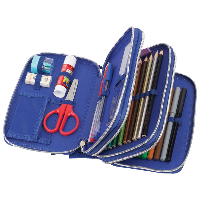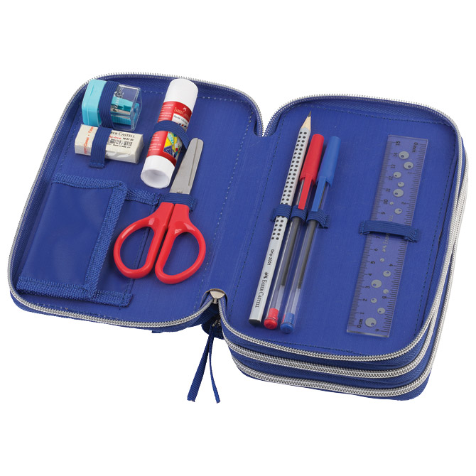 3 zipa; Faber- Castell punjenje s 44 komada pribora: flomaster školski 18 boja, boje drvene 18 boja, 1 olovka grafitna HB, šiljilo, gumica, ravnalo 15 cm, ljepilo 9g, škare, 2 olovke kemjske (plava i crvena); visokokvalitetna podstava i zatvarači T-rex Pakiranje: 1/4/16