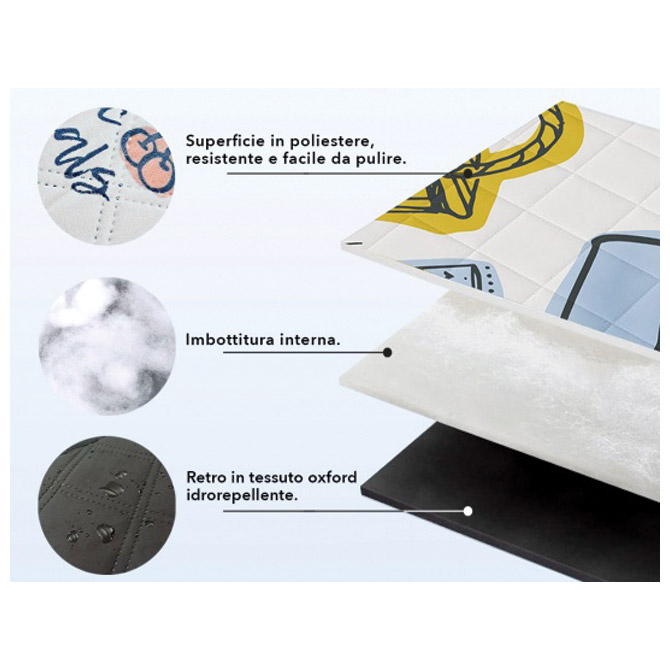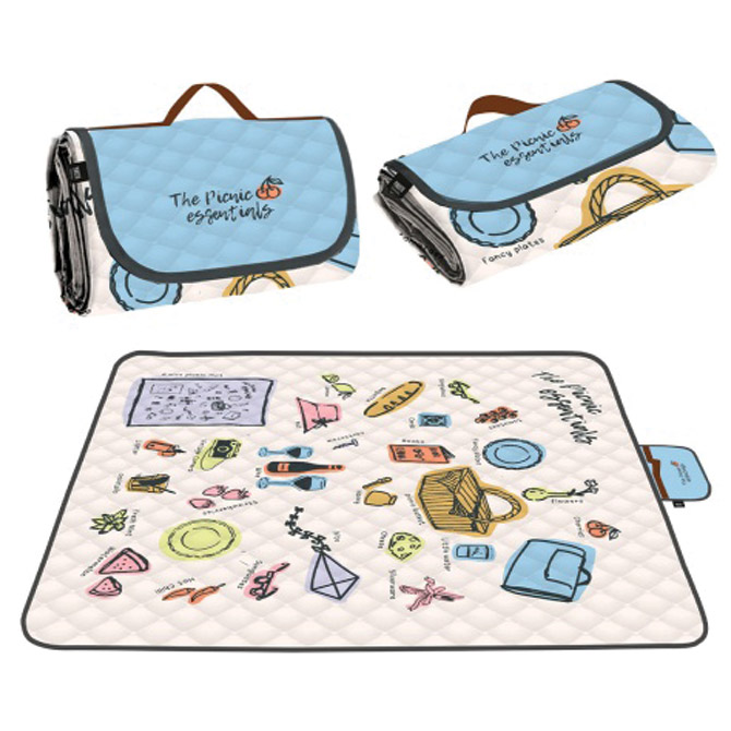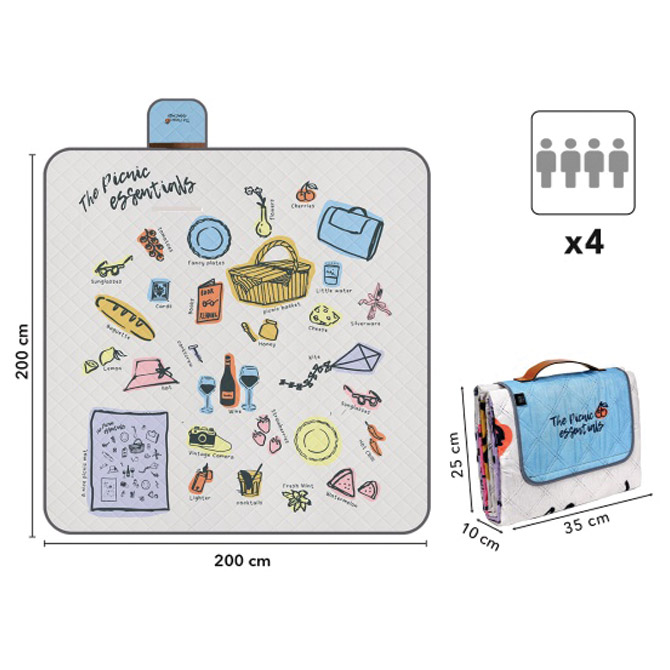 Preklop s čičak trakom za jednostavno sklapanje i nošenje; troslojna; donja starna vodootporna; prva strana polyester-lako za čišćenje; dim. složene podloge: 35x25x10cm; dim. otvorene podloge 200cmx200cm Pakiranje: 1/3/10
