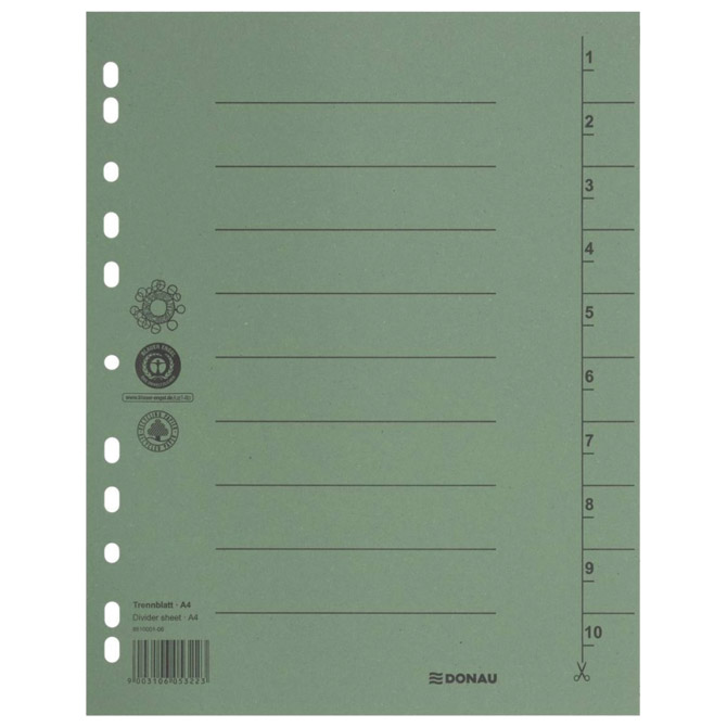 format: A4; dimenzija: 235×300 mm; karton; 250 g/m2; 11 rupa; na 1 listu brojevi 1-10 koji se mogu izrezati po otisnutoj liniji; set od 100 komada Pakiranje: 1/5