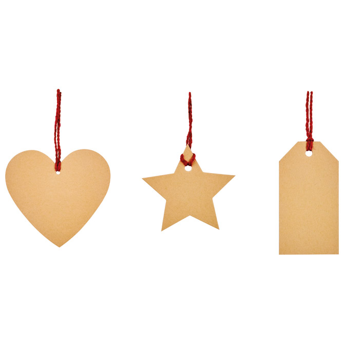 sa crvenom vrpcom koja je provučena kroz privjesnicu; smeđi kraft karton; 3 motiva: srce, zvijezda i pravokutnik; set od 4 komada; u prozirnoj pvc vrećici; blister Pakiranje: 1/72